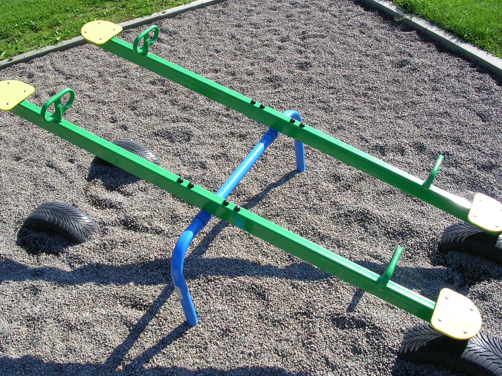 A seesaw is a long, narrow board pivoted in the middle so that, as one end goes up, the other goes down. A person sits on each end, and they take turns pushing their feet against the ground to lift their side into the air. Playground seesaws usually have handles for the riders to grip as they sit facing each other.